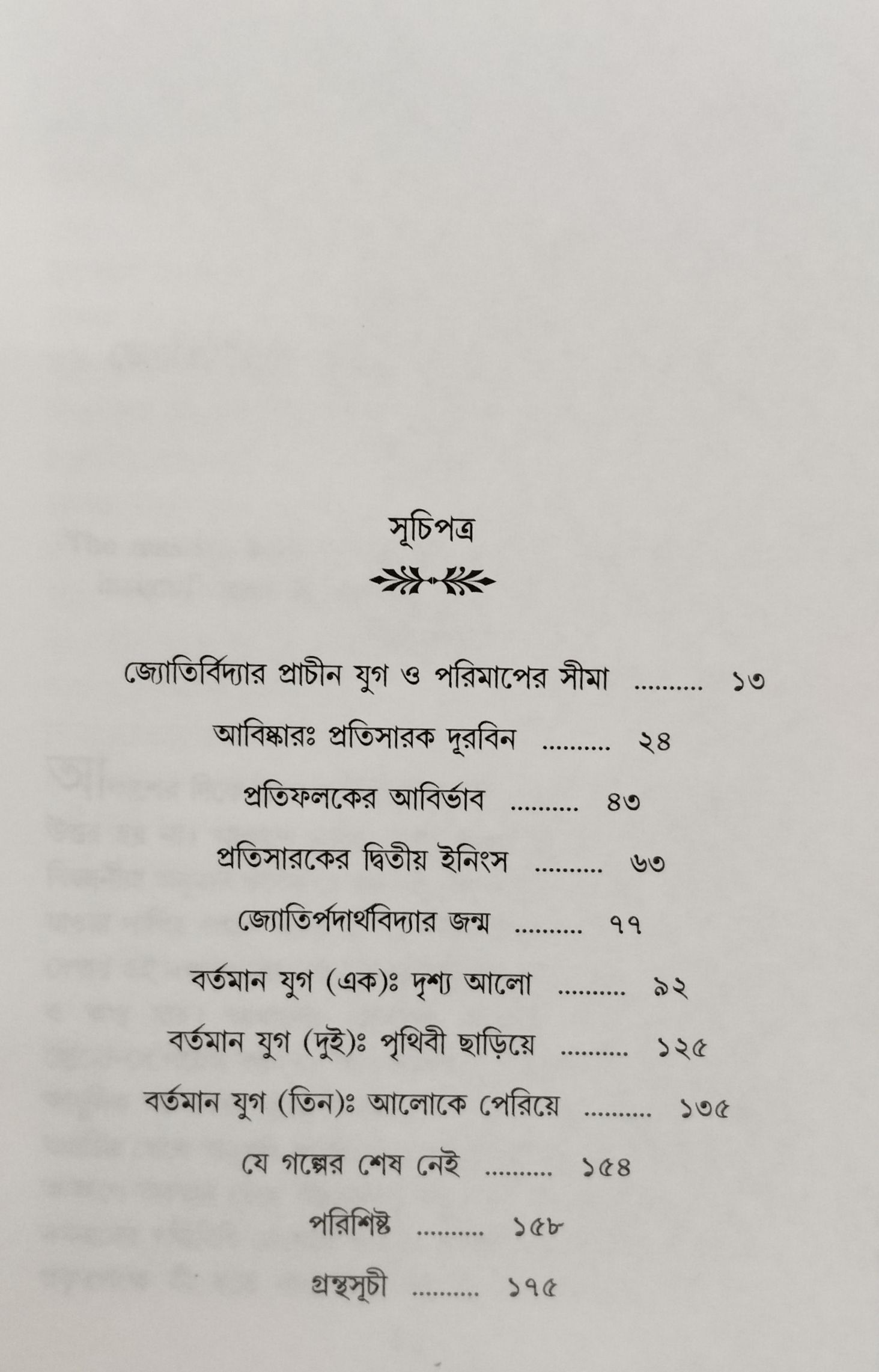 হল এমন এক উদ্ভাবন যা জ্যোতির্বিদ্যায় বিপ্লব এনে সভ্যতার বিকাশের ধারাকে পালটে দিয়েছিল। আমরা বুঝেছিলাম চোখে যা দেখতে পাই, তার বাইরে রয়েছে এক বিরাট বিশ্ব। শুধু তাই নয়, দূরবিন আমাদের পর্যবেক্ষণ, বহুদিনের সযত্ন লালিত বিশ্বাস এবং সাধারণ বুদ্ধিকে প্রশ্ন করতে শিখিয়েছিল-এই প্রশ্ন ছাড়া আধুনিক বিজ্ঞানের জন্ম হত না, পরবর্তীকালের প্রযুক্তির বিকাশও সম্ভব ছিল না। এক কথায় বলতে গেলে মধ্যযুগের সমাপ্তি ঘটিয়ে আধুনিক যুগের সূচনা করেছিল ওই যন্ত্রটি। একই সঙ্গে বিশ্বব্রহ্মাণ্ড সম্পর্কে আমাদের ধারণার বহু পরিবর্তন সে করেছে। এই বই সেই দুই পরস্পর সংযুক্ত পরিবর্তনের কাহিনি। তবে এ বই জ্যোতির্বিদ্যার ইতিহাস নয়, দূরবিনের গল্প। দূরবিন আবিষ্কারের পর চারশো বছর পেরিয়ে গেছে। দূরবিন শুধু দূরেই দ্যাখে তা নয়, অতীতের দিকেও দৃষ্টিপাত করে। সহস্র কোটি আলোকবর্ষ দূরের যে গ্যালাক্সির আলো আজ আমাদের দূরবিনে ধরা দিল, সে যখন যাত্রা শুরু করেছিল তখন হয়তো সূর্যেরই সৃষ্টি হয়নি। স্পেস টেলিস্কোপ, রেডিয়ো টেলিস্কোপ বা গ্র্যাভিটেশনাল ওয়েভ ডিটেক্টর-দূরবীনের ক্রমবিবর্তন এখনও অব্যহত, সঙ্গে আমাদের জ্ঞান-বিজ্ঞানেরও।