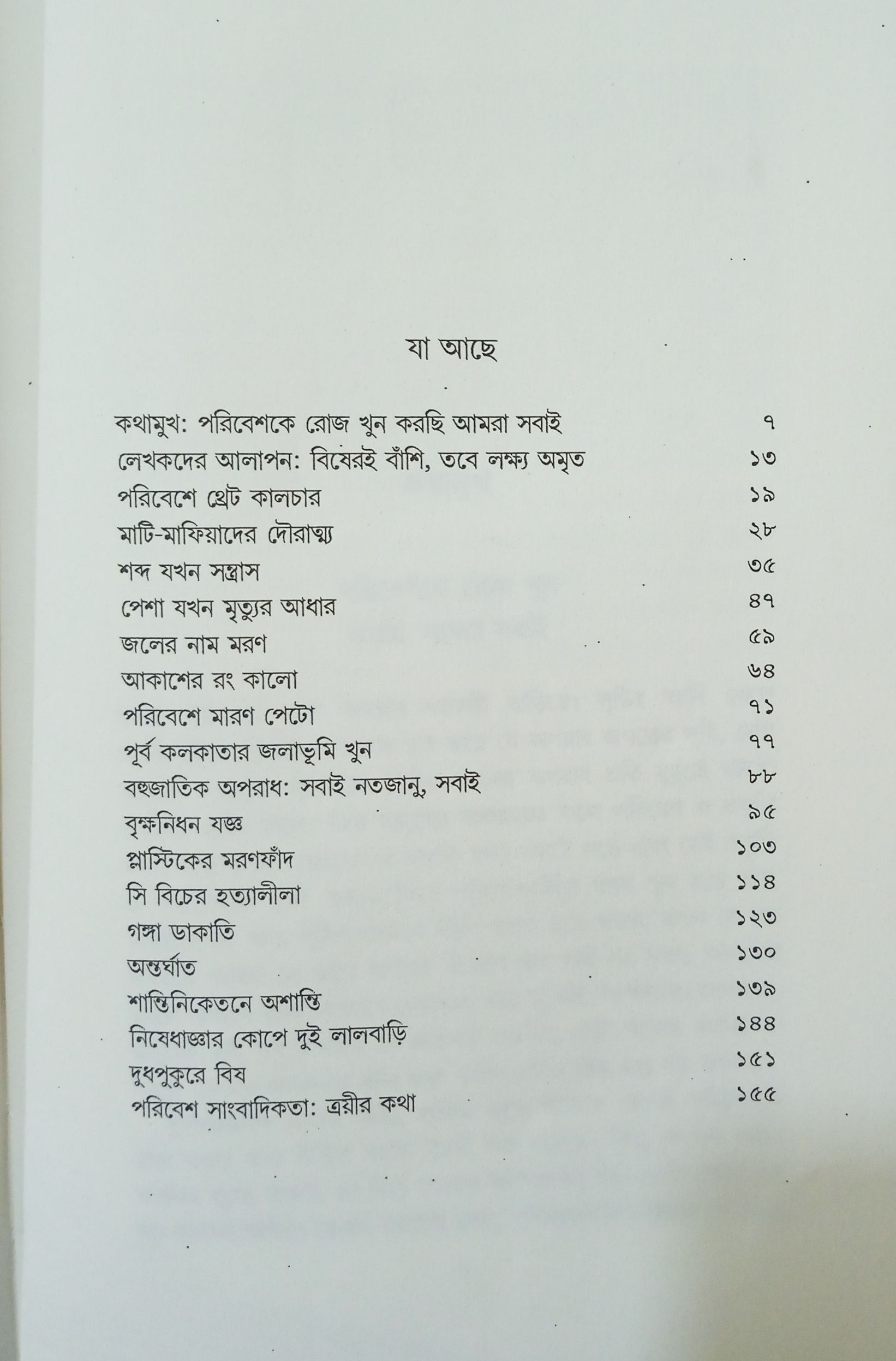 পুকুর চুরি তো শোনা কথা। কিন্তু গদ্য ডাকাতি। মাটি ও আবর্জনা ফেলে গাজা ভূজিয়ে তার উপর বিনোদন পার্ক তৈরি, বহুতল নির্মাণ। পাথর ভাতার কলে কাজ করা শ্রমিকদের বুকে বাসা বাঁধছে মারণ রোগ মিলিকোসিম। কিন্তু স্থানীয় রাজনৈতিক নেতারা বলছেন, খালি পেটে মদ খেয়ে যক্ষ্মা হচ্ছে শ্রমিকদের। সমুদ্র সৈকতকে তছনছ করে সম্পূর্ণ বেআইনি ভাবে গড়ে ওঠা মন্দারমণির ৫২টা ছোটেল ভেঙে দিতে ২০০৮ সালে নির্দেশ দিয়েছিল কলকাতা হাইকোর্ট। তখন হাইকোর্টের সেই নির্দেশ মানা হয়নি কোন চিট ফান্ড সংস্থার স্বার্থ রক্ষায়? পরিবেশের ক্ষতি করা বেআইনি কলকারখানা গুলোর বিরুদ্ধে রুখে দাঁড়ানো সরকারি অফিসারের বাড়িতে ফোন এল তাঁর ছেলেকে অপহরণের হুমকি দিয়ে। তার পরেও সেই অকুতোভয় অফিসার কী ভাবে তাঁর ঘোটা চাকরি জীবনে পরিবেশকে সুস্থ রাখার লড়াই করে গেলেন দুর্নীতি ও অনিয়মের নাগপাশের মধ্যেও। বাংলা-সহ গোটা ভারতে পরিবেশ সংক্রান্ত বই কিছু কম নেই। কিন্তু পরিবেশ অপরাধ ও পরিবেশ অপরাধীদের উপর সম্ভবত প্রথম বই এটাই। যেখানে সামনে আনা হয়েছে এত দিন ধরে চাপা থাকা ভয়ঙ্কর কিছু সত্যকেও।