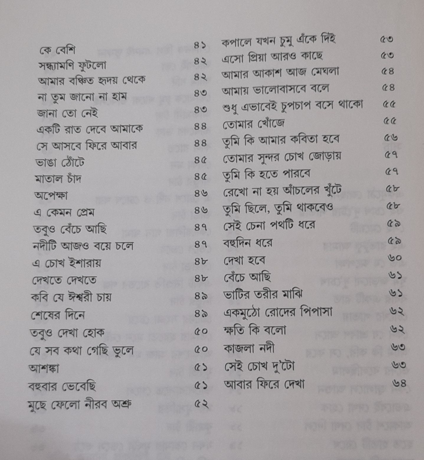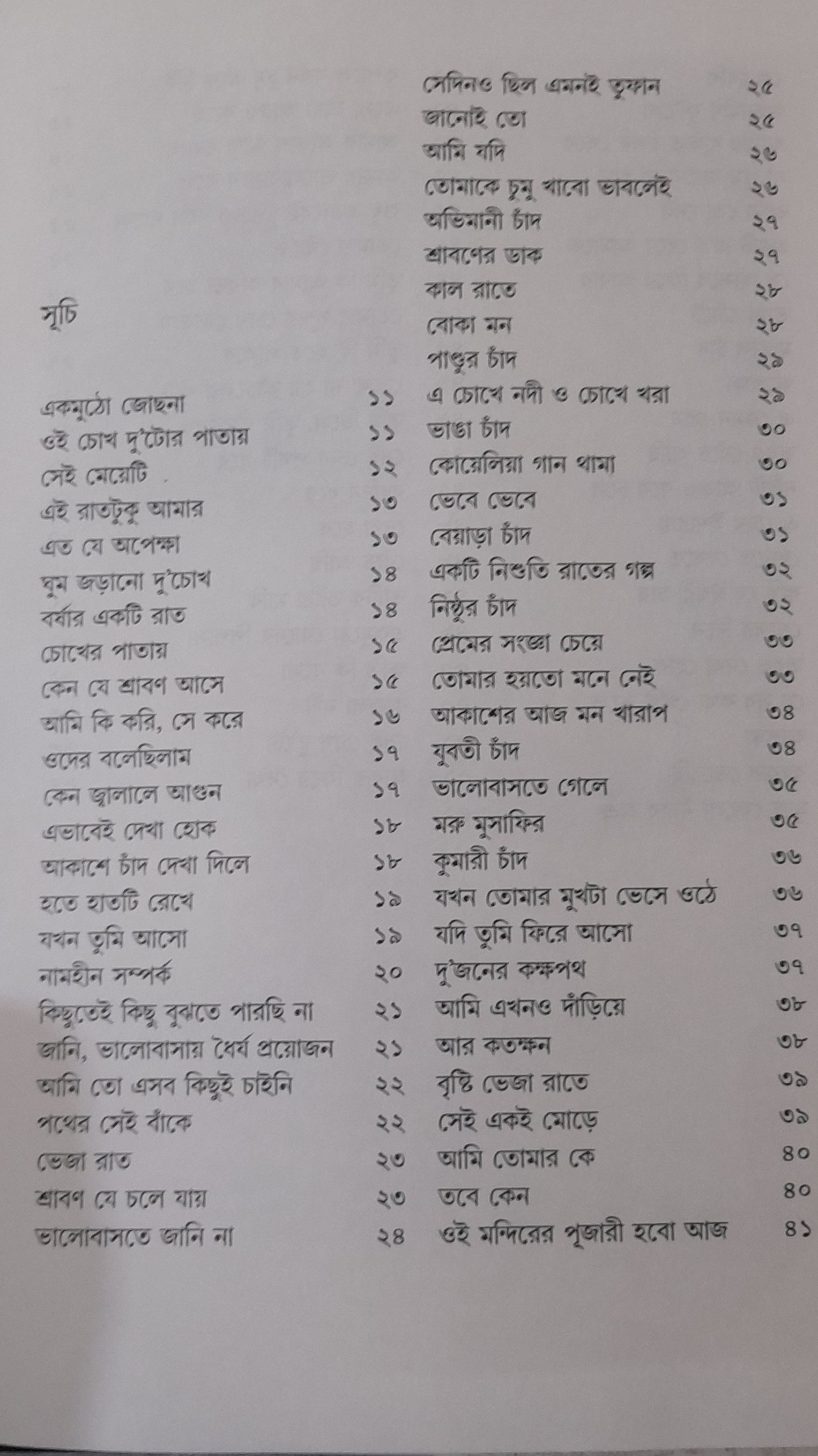 রাতের আকাশ কবির খুব পছন্দ। তার প্রেয়সীকে মনে পড়লে চাঁদনীতে ভাসতে ভাসতে তার কাছে পৌঁছে যায়। দু-চোখ ভরে দেখে তার ঘুমন্ত মুখখানা, সমস্ত জোছনা ভিড় করেছে তার মুখে, পানপাতা মুখ, কুঁচকানো চিবুকে কালোজিরের মতো ছোট্ট একটি তিল চিকচিক করে, দিগন্তরেখা চিলের ডানার মতো ক্র আর তার নীচে আধবোজা চোখে খেলে যায় কাজলা নদী, কবি সাঁতার কাটতে থাকে সেই নদীর জলে। ফেরার পথে কবি ভাবতে থাকে সে জোছনা চেয়েছিল না গোটা আকাশ।