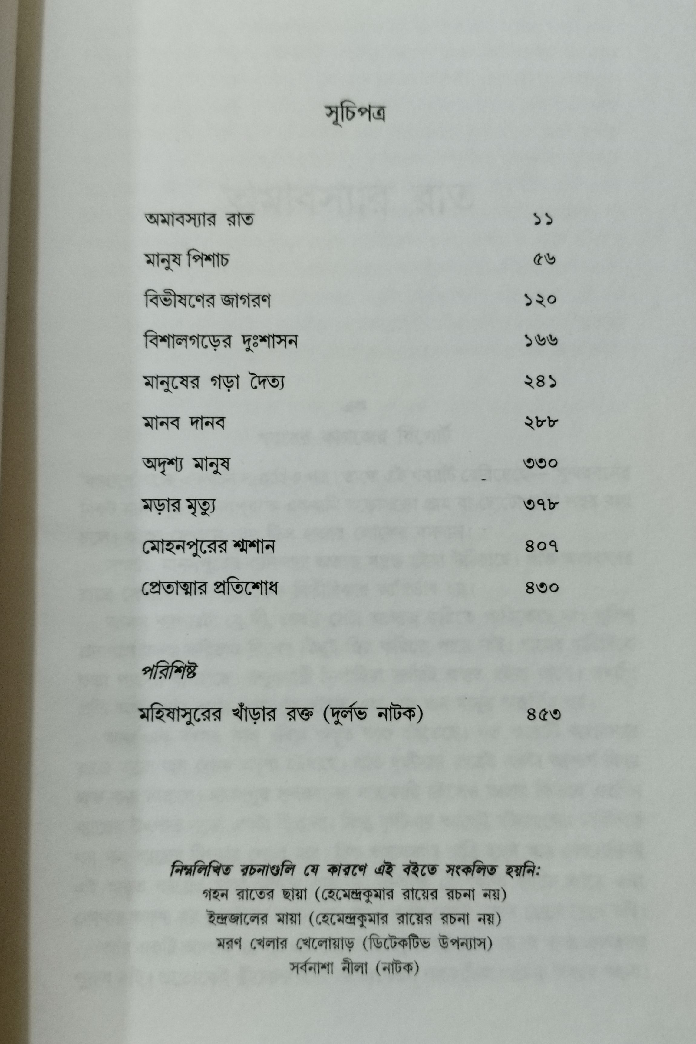 দুই মলাটে এই প্রথমবার হেমেন্দ্রকুমার রায়ের যাবতীয় ভয়াল উপন্যাসকে সমগ্র আকারে হাজির করল, 'বুক ফার্ম'। বর্তমান সংকলনে লেখকের ভয়াল সাতটি উপন্যাস, তিনটি উপন্যাসিকা ও পরিশিষ্টে একটি দুর্লভ নাটক সন্নিবেশিত হয়েছে। বইটিতে গৃহীত রচনাগুলো বিদেশি সাহিত্যের ছায়া অবলম্বনে রচিত হলেও এগুলোর প্রতিটিতে লেখক রোমাঞ্চকর, আতঙ্কঘন ও শিহরন জাগানো আবহ সৃষ্টিতে অভিনবত্বের স্বাক্ষর রেখেছেন। বইটি এগারোটি ভয়াল রচনার বৃহৎ সংকলন। রয়েছে তিনটি দুষ্প্রাপ্য রচনা: মানব দানব, অদৃশ্য মানুষ, মহিষাসুরের খাঁড়ার রক্ত। সম্পাদনা করেছেন হেমেন্দ্রকুমার গবেষক পার্থসারথি চট্টোপাধ্যায়।