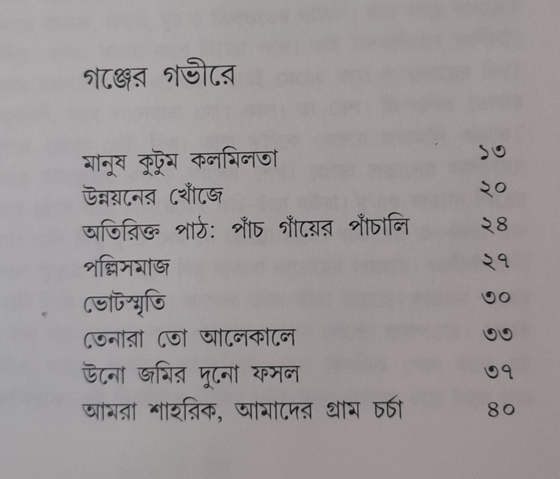 এ গ্রন্থে যেমন শরৎবাবুর চন্ডীমন্ডপের বজ্জাত গ্রামের কথা আছে, তেমনি আছে যতীন্দ্রমোহন বাগচির, 'ওই যে গাঁ-টি যাচ্ছে দেখা আইড়ি ক্ষেতের আড়ে...' গ্রামও। বাদ পড়েনি রাজনৈতিক চাপান সারের গ্রামও।