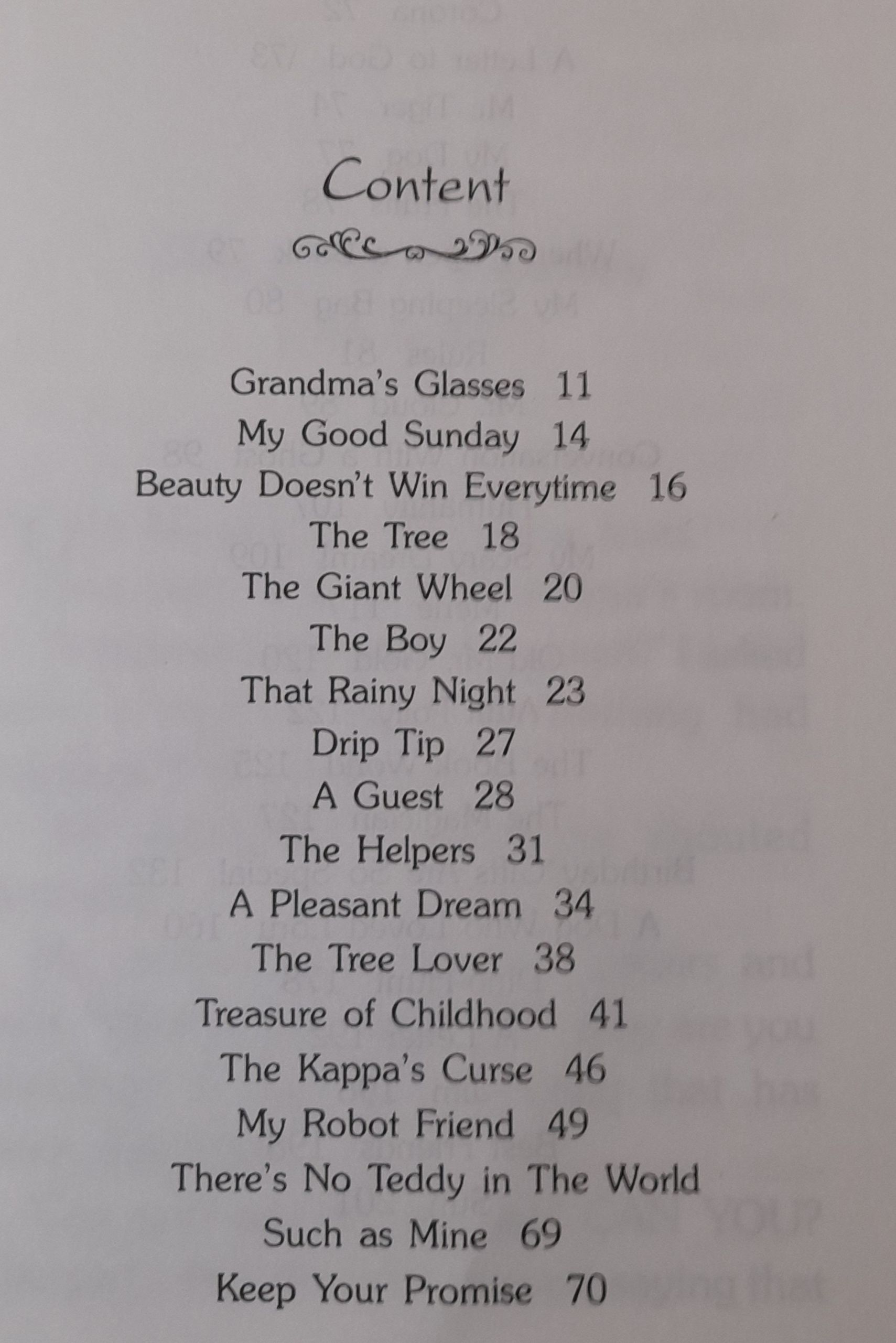 The book is a collection of stories, poems and letters which contains multidimensional and multilayered thoughts of Upasana. In some of the writings, she nicely expressed the values that she has learnt from her family and school, the relationship of a child with her loved ones like parents, grandparents, friends, neighbours etc. through different characters and events of mundane life.