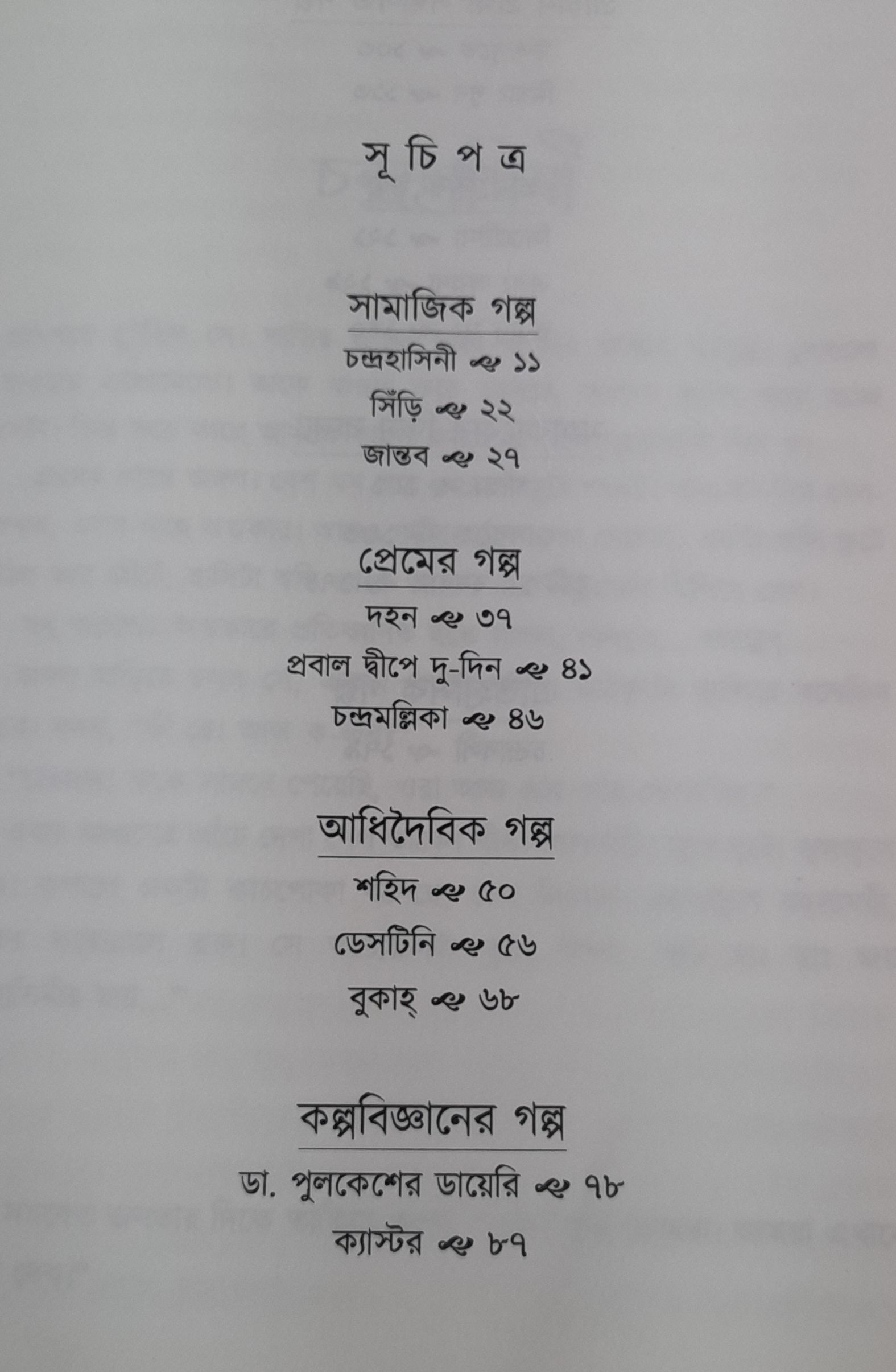 তিনটি আধিদৈবিক গল্প, দুটি কল্পবিজ্ঞানের গল্প ও দুটি প্রাচীন প্রথা সম্বলিত গল্প রয়েছে, যা পাঠককে আনন্দ দেবে বলেই বিশ্বাস।