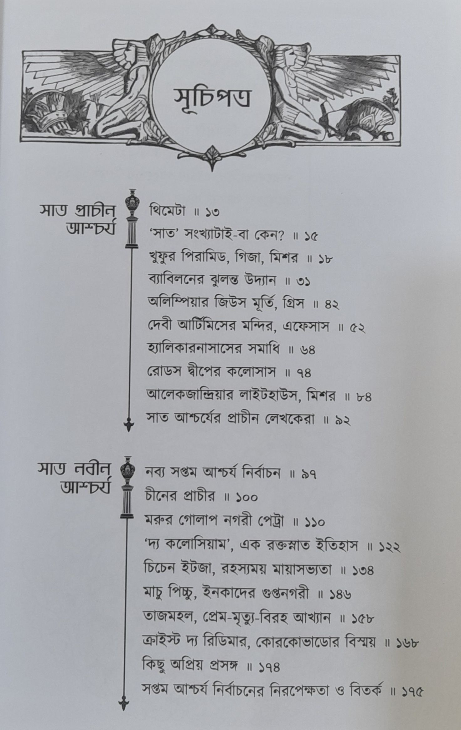 অর্থাৎ, সবমিলিয়ে চোদ্দোটা আশ্চর্য। খুফুর পিরামিড, ব্যাবিলনের ঝুলন্ত উদ্যান, অলিম্পিয়ার জিউস মূর্তি, আর্টিমিসের মন্দির, হ্যালিকারনাসাসের সমাধি, রোডসের কলোসাস এবং আলেকজান্দ্রিয়ার লাইটহাউস- এই প্রাচীন সাত আশ্চর্য নিয়ে তৈরি হয়েছে প্রথম তালিকা। দ্বিতীয় তালিকার সদস্যরা তুলনামূলকভাবে বয়সে নবীন। অন্তর্জালে বিশ্বব্যাপী ভোটাভুটির মাধ্যমে নির্বাচন করা হয়েছিল এদের। এই স্থাপত্যগুলো হল চীনের প্রাচীর, পেট্রা, কলোসিয়াম, চিচেন ইটজা, মাচু পিচ্চু, তাজমহল এবং ক্রাইস্ট-দ্য-রিডিমার। তবে এই নির্বাচন প্রক্রিয়া ক্রয়া একইসঙ্গে জন্ম দিয়েছে মহাবিতর্কের। কারণ তথাকথিতভাবে কম সংখ্যায় ভোট পাওয়ার কারণে বাদ পড়ে গেছে এমন কিছু সুযোগ্য প্রতিনিধি যারা কিনা অনায়াসেই জায়গা করে নিতে পারত এই তালিকায়। এরকমই সাতটা 'আশ্চর্য'-র কথা নিয়ে থাকছে আরও একটা অধ্যায়। সবমিলিয়ে ২১ আশ্চর্যের রাজসূয় আয়োজন এই বইতে। একদিকে বিপুল পরিমাণে তথ্য, অন্যদিকে ইতিহাসের অলৌকিক বিভা মাখা অসংখ্য গল্পে-মিথে-ছবিতে সেজে উঠেছে পাতার পর পাতা। সপ্ত আশ্চর্যের সেই জাদু অলিন্দে ডানা মেলে উড়ে বেড়াতে আপনি তৈরি তো?