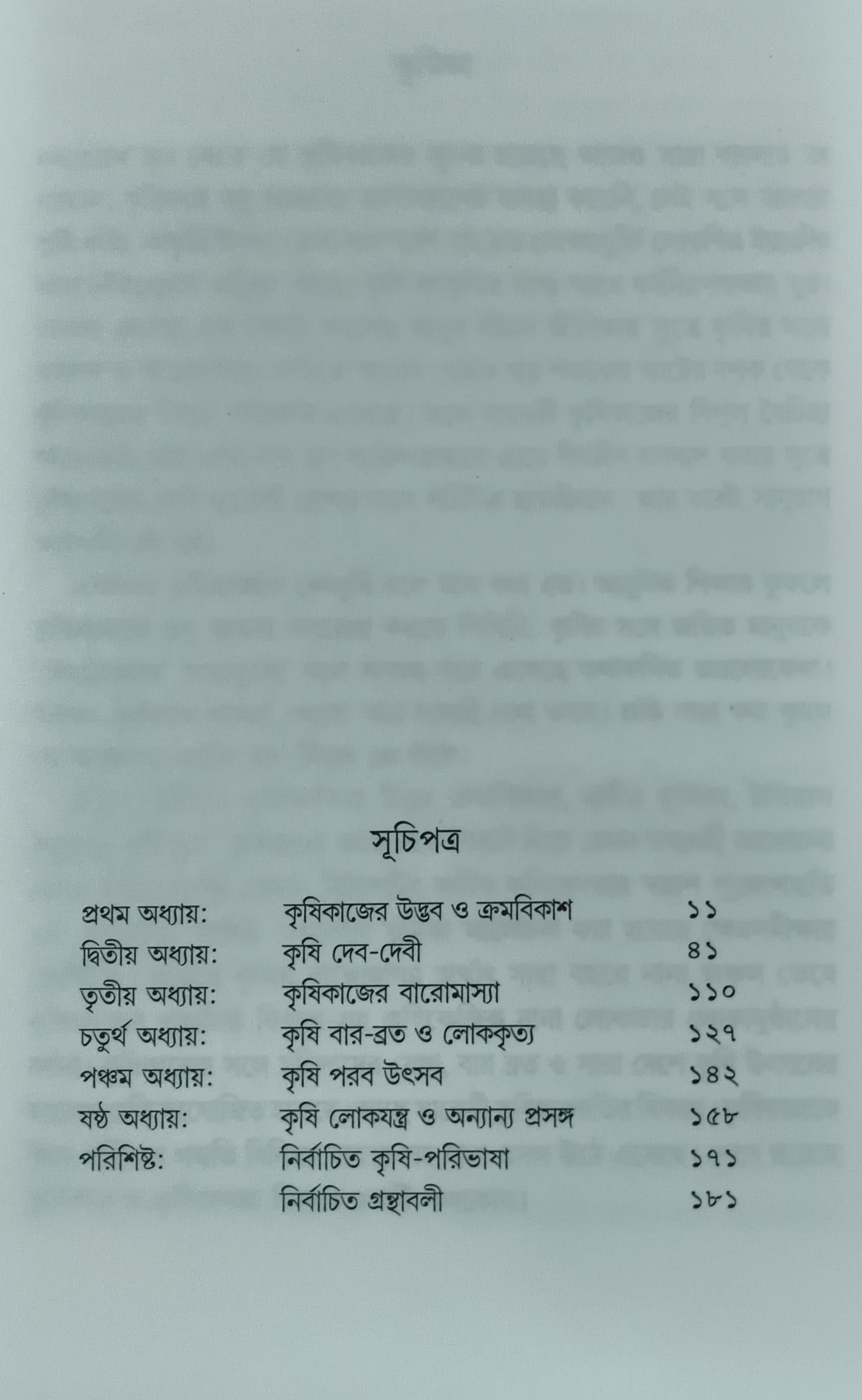 'বাংলার কৃষিকাজ ও কৃষিদেবতা' বইটিতে কৃষিকাজের উদ্ভব, ক্রমবিকাশ, নারীর ভূমিকা, ইতিহাস ও বচন ইত্যাদি নিয়ে তথ্যধর্মী আলোচনা প্রত্নতত্ত্বে কৃষিকাজ, কৃষিকাজে খনার করা হয়েছে। তিরিশটির অধিক কৃষিদেবতার স্বরূপ, পুজোপদ্ধতি এবং কৃষিকাজে সংশ্লিষ্ট দেবদেবীর ভূমিকা আলোচনা করা হয়েছে ক্ষেত্রসমীক্ষার প্রেক্ষিতে। কৃষির বারমাস্যা অর্থাৎ সারাবছরে নানা অঞ্চলভেদে কৃষিকাজের তথ্যনিষ্ঠ বিবরণ-সহ কৃষিকেন্দ্রিক নানা লোকাচার ও লোকানুষ্ঠানের বর্ণনা। কৃষিকাজের সঙ্গে মহিলাদের যোগ, বার ব্রত ও সারা দেশে কৃষি উৎসবের আলেখ্যগুলি সংযোজিত হয়েছে। এবং শেষে সংযোজিত হয়েছে কৃষিকাজ ও কৃষিদেবতা বিষয়ক একটি শব্দকোষ।