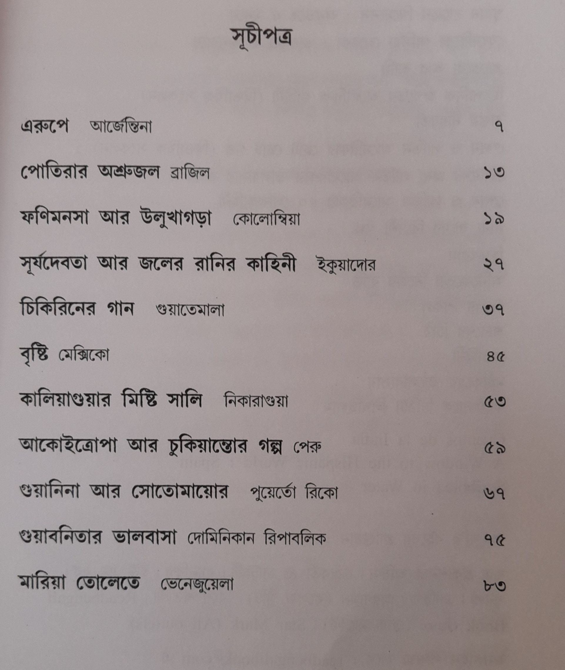 অতলান্তিক মহাসাগর পাড়ি দিয়ে ক্রিস্তোফার কলম্বাস পা রাখলেন সম্পূর্ণ অচেনা এক মহাদেশে। সেই মহাদেশ ক্রমে হয়ে উঠল স্পেন এবং পর্তুগালের উপনিবেশ যাকে আজ আমরা মধ্য ও দক্ষিণ আমেরিকা বলে জানি এবং এক কথায় তাদের লাতিন আমেরিকা বলা হয়ে থাকে। কিন্তু একথা অনেকেরই হয়তো অজানা যে ইউরোপীয়রা আসার আগেও এই মাটিতে গড়ে উঠেছিল এক সমৃদ্ধ সভ্যতা। আর সেই সভ্যতার সঙ্গে অঙ্গাঙ্গীভাবে মিশে ছিল তাদের প্রজন্ম থেকে প্রজন্মে বয়ে যাওয়া গল্পের পরম্পরা। তাদের কোনো লিপি ছিল না তাই সেই মৌখিক পরম্পরার কাহিনীগুলি পরবর্তী দিনে গ্রন্থিত হয়েছে স্পেনীয় বিজেতাদের কলমেই। এমনই এগারোটি দেশের এগারোটি গল্পকে নিয়ে এই সংকলনটি যে গল্পগুলি ভালোবাসার গল্প-মানুষের চিরদিনের বিরহ-মিলনের কাহিনী।